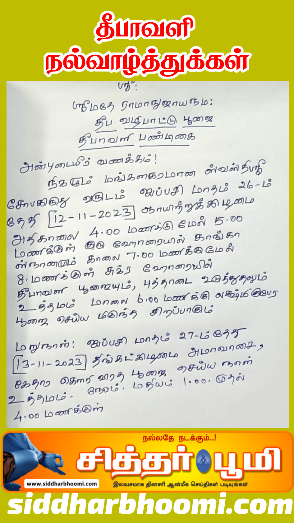 நிகழும் மங்களகரமான ஸ்வஸ்திஸ்ரீ சோபகிருது வருடம் ஜப்பசி மாதம் 26-ம் தேதி 12-11-2023] ஆாயிற்றுக்கிழமை அதிகாலை 4.00 மணக்கு மேல் 5.00 மணக்குள் குரு ஹோரையில் காங்கா ஸ்நானமும் காலை 7.00 மணிக்குமேல் 8. மணக்குள் சுக்ர ஹோரையில் தீபாவளி பூஜையும், புத்தாடை உடுத்துதலும் உத்தமம் மாலை 6.00 மணக்கு லஷ்மிகுபேர பூஜை செய்ய மிகுந்த சிறப்பாகும்