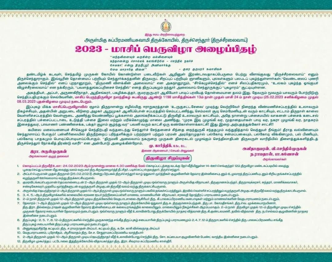 அருள்மிகு சுப்பிரமணியசுவாமி திருக்கோயில், திருச்செந்தூர் (திருச்சீரலைவாய்) 2023 – மாசிப் பெருவிழா அழைப்பிதழ்